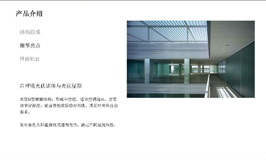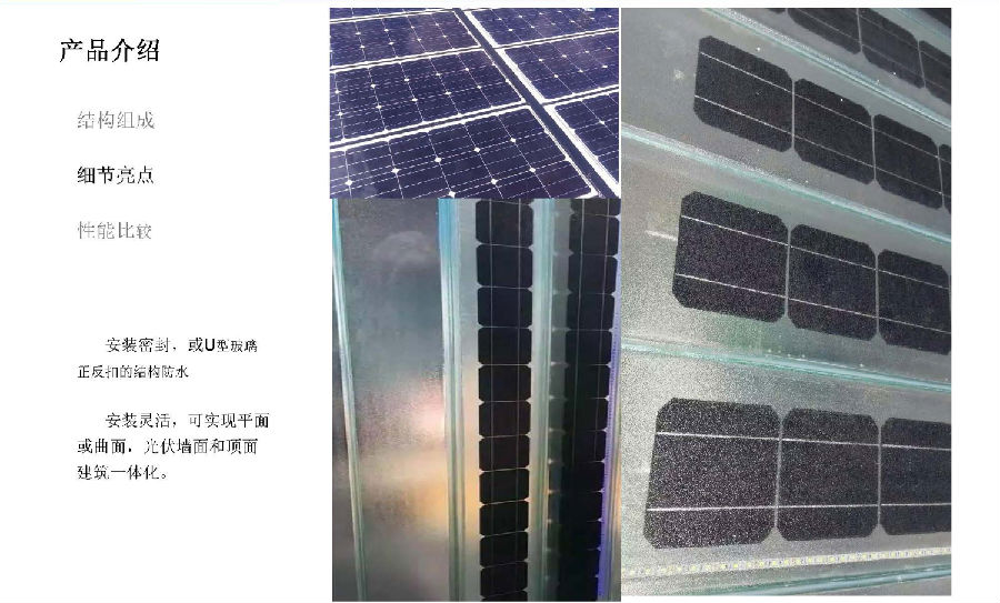 公司研发出整套UBIPV方案,使太阳能发电不再是依附于建筑上的电力项目,而是与建筑合二为一,兼具了建筑及太阳能发电功能。U型发电玻璃建材可拼装或模块化、有效减少了建筑及太阳能发电系统安装的结构件,降低了材料成本和人工维护成本,提高了建筑的实用性与综合使用价值。